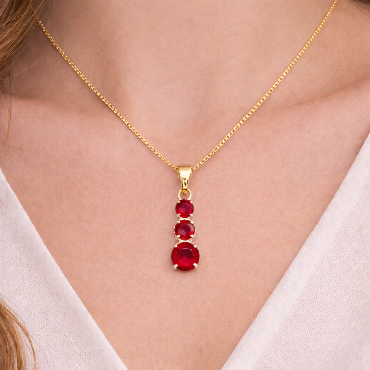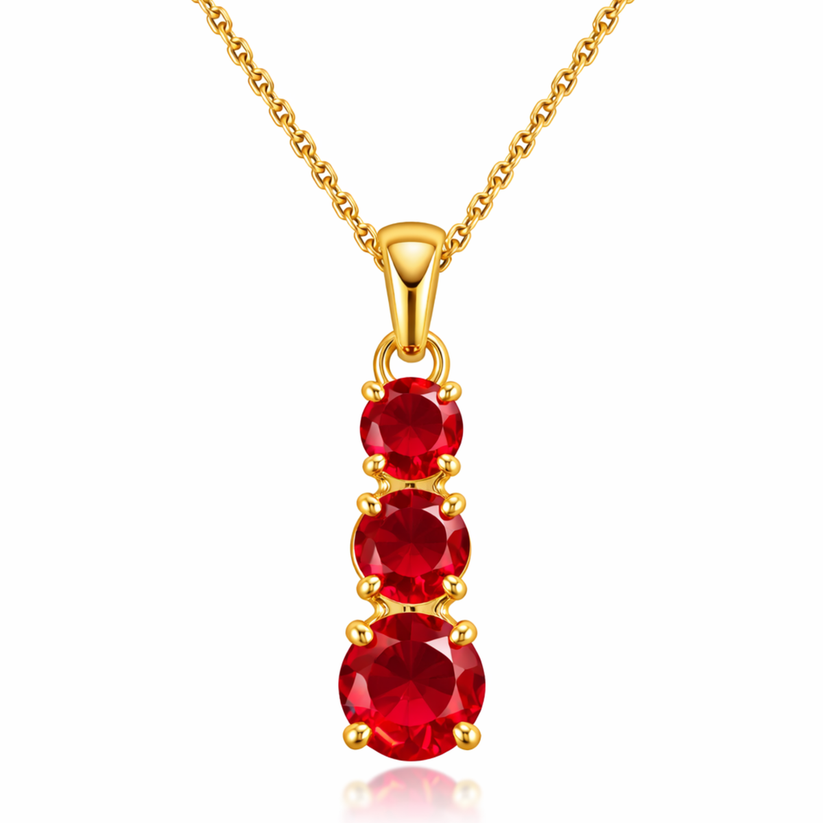 Elegant and timeless, The Regal Trinity Ruby Pendant features three round-cut ruby stones arranged in a graceful vertical drop design. Each stone is securely set to enhance its natural sparkle and rich red brilliance.