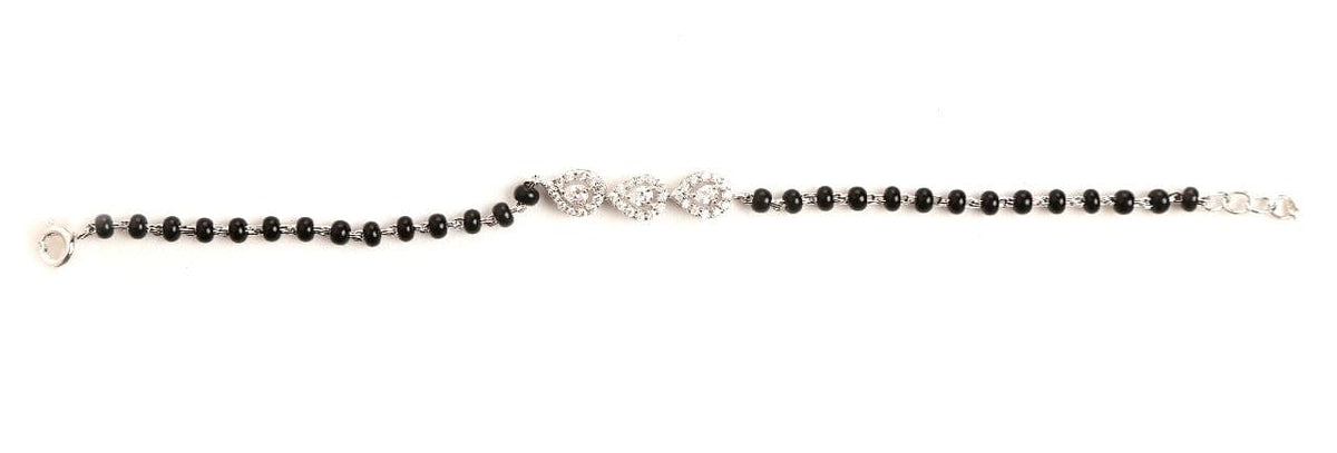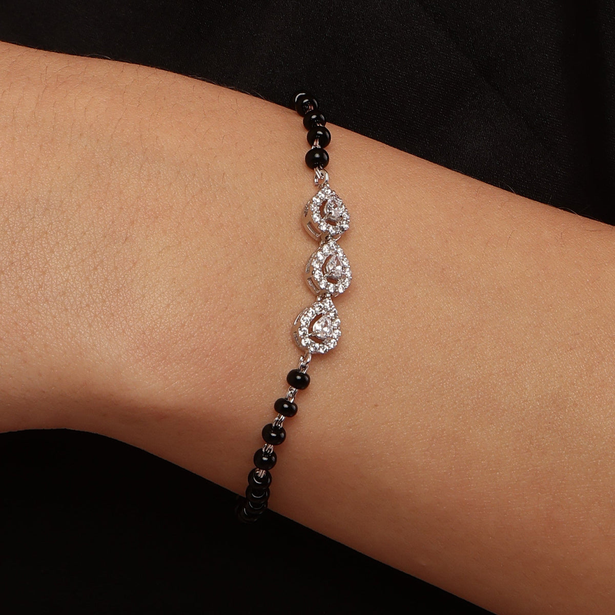 "Exuding timeless beauty, the Trio Pear Elegance bracelet combines the classic symbolism of the Mangalsutra with the allure of three delicately crafted pear-shaped accents. A harmonious blend of tradition and modern sophistication, perfect for the woman who cherishes both heritage and style."