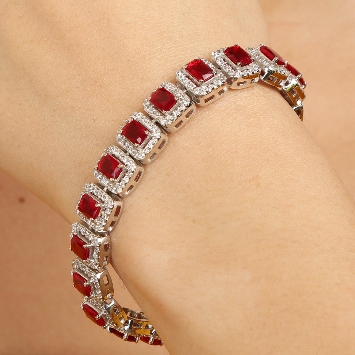 The Regal Radiance Bracelet is a timeless masterpiece crafted in pure 92.5 sterling silver, adorned with brilliant-cut stones available in Ruby Red and Sapphire Blue. Each gemstone is encircled with a halo of shimmering accents, creating a royal charm that elevates any look — from elegant evenings to celebratory occasions.